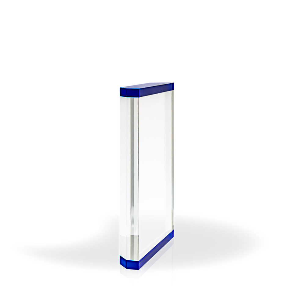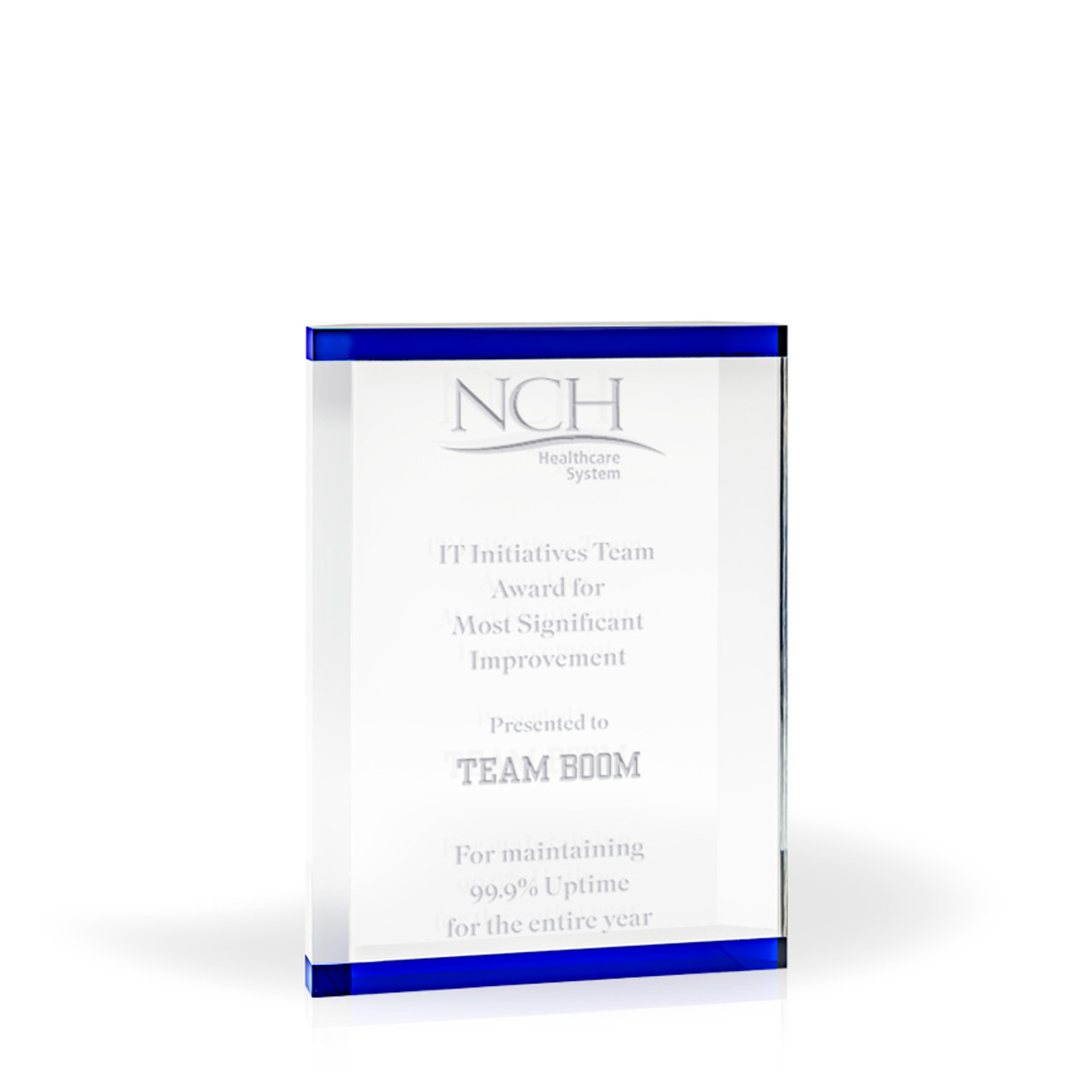 The Dory is an elegant and versatile award. Featured here is the Dory with blue accents at the top and at the base of the award. The clear acrylic front of the award offers plenty of space for adding content and logos. Perfect for customizing with any type of recognition.